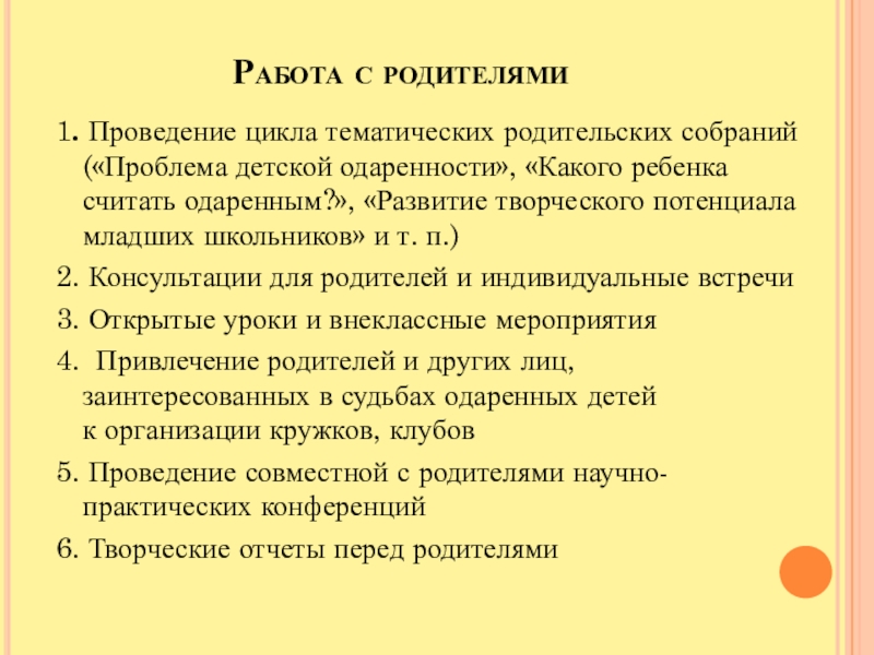 Работа с родителями1. Проведение цикла тематических родительских собраний («Проблема детской одаренности», «Какого ребенка считать одаренным?», «Развитие творческого потенциала