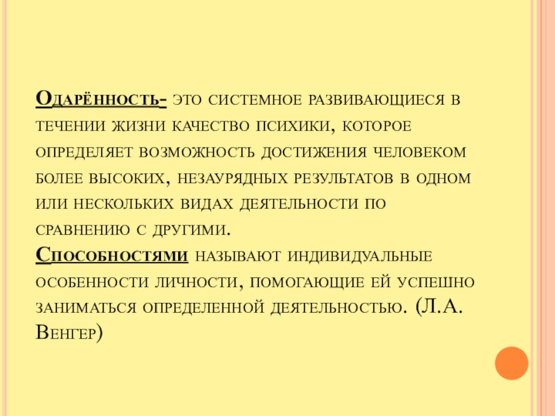 возможность достижения человеком более высоких, незаурядных результатов в одном или нескольких видах деятельности по сравнению с другими. Способностями называют индивидуальные особенности личности, помогающие ей успешно заниматься определенной деятельностью. (Л.А. Венгер)