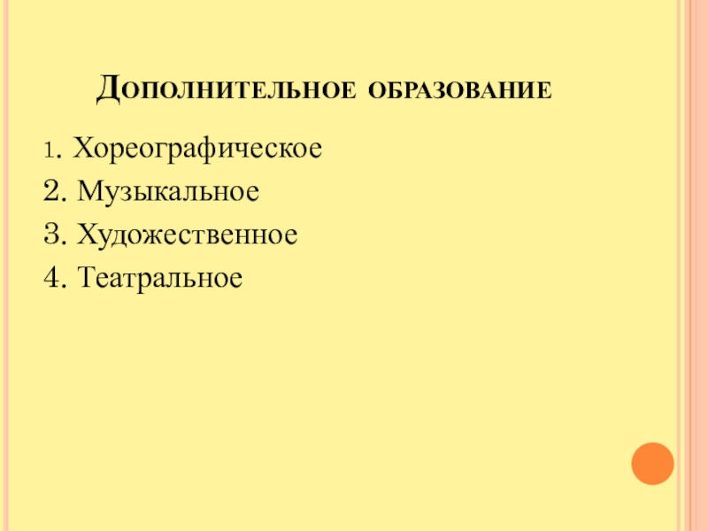 Дополнительное образование1. Хореографическое2. Музыкальное3. Художественное4. Театральное