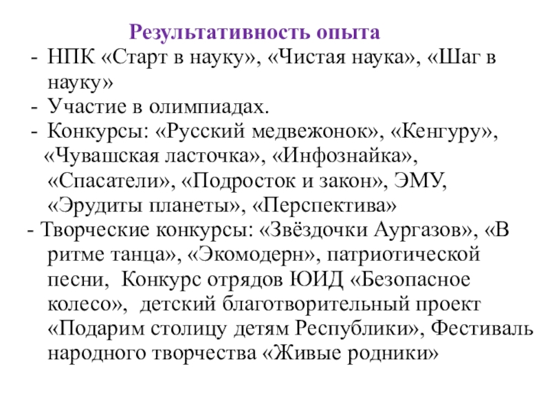«Чувашская ласточка», «Инфознайка», «Спасатели», «Подросток и закон», ЭМУ, «Эрудиты планеты», «Перспектива»