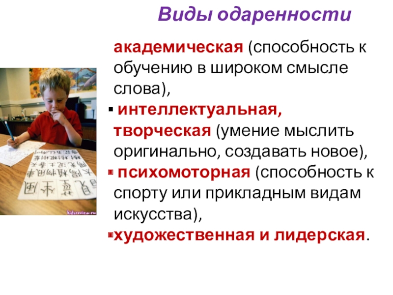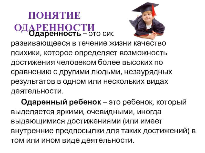 Одаренный ребенок – это ребенок, который выделяется яркими, очевидными, иногда выдающимися достижениями (или имеет внутренние предпосылки для таких достижений) в том или ином виде деятельности.