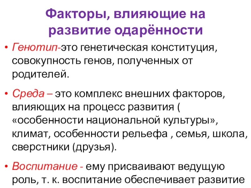 Среда – это комплекс внешних факторов, влияющих на процесс развития ( «особенности национальной культуры», климат, особенности рельефа , семья, школа, сверстники (друзья).