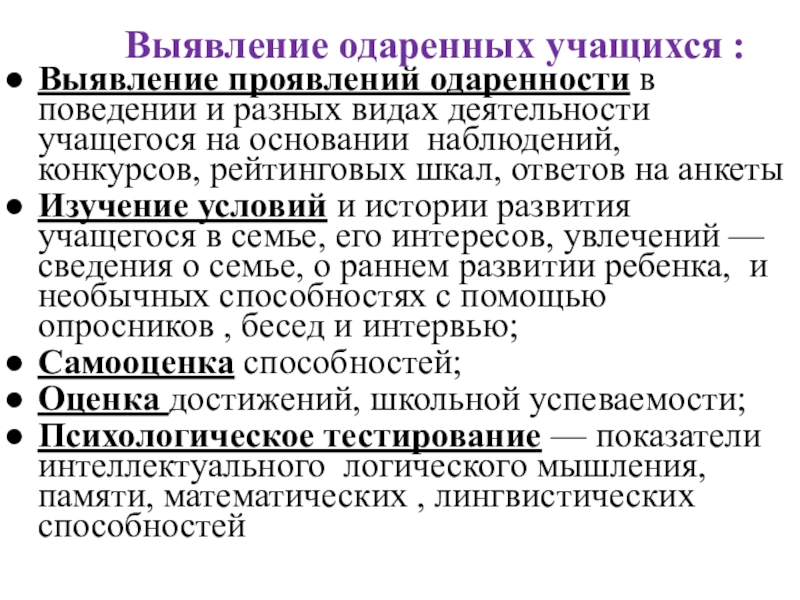 Изучение условий и истории развития учащегося в семье, его интересов, увлечений — сведения о семье, о раннем развитии ребенка, и необычных способностях с помощью опросников , бесед и интервью;