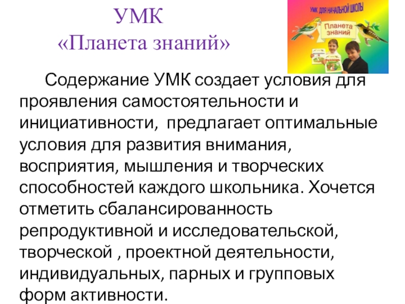Содержание УМК создает условия для проявления самостоятельности и инициативности, предлагает оптимальные условия для развития внимания, восприятия, мышления и творческих способностей каждого школьника. Хочется отметить сбалансированность репродуктивной и исследовательской, творческой , проектной деятельности, индивидуальных, парных и групповых форм активности.