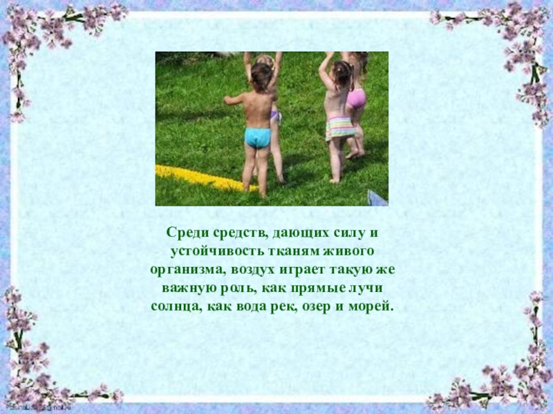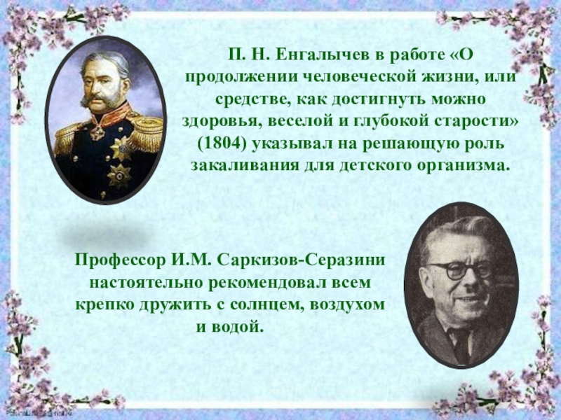 Профессор И.М. Саркизов-Серазини настоятельно рекомендовал всем крепко дружить с солнцем, воздухом и водой.