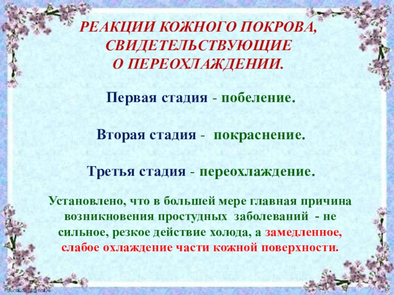 Установлено, что в большей мере главная причина возникновения простудных заболеваний - не сильное, резкое действие холода, а замедленное, слабое охлаждение части кожной поверхности.
