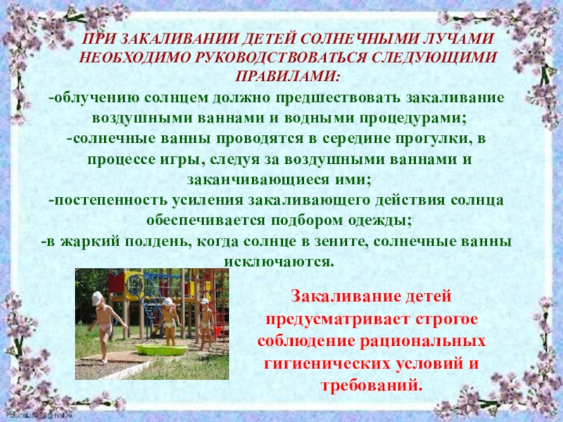Закаливание детей предусматривает строгое соблюдение рациональных гигиенических условий и требований.