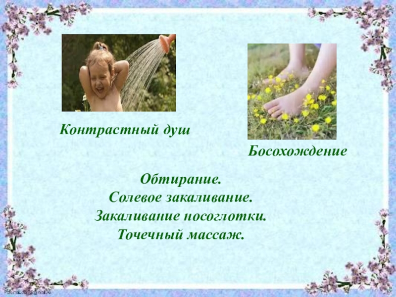 Закаливание означает тренировку адаптивных возможностей организма при систематическом воздействии воздуха, воды, солнечных лучей на кожные рецепторы. В первую очередь при этом совершенствуются процессы терморегуляции.