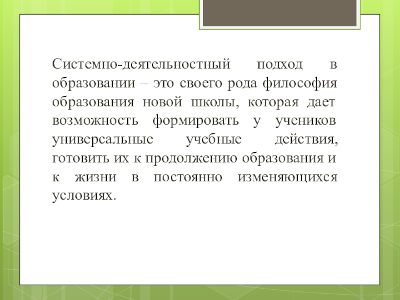 Слайд 18Системно-деятельностный подход в образовании – это своего рода философия образования новой
