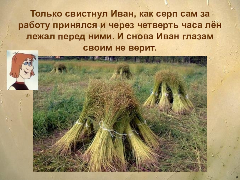 Слайд 15 Только поднесла она к нему нити льняные, как