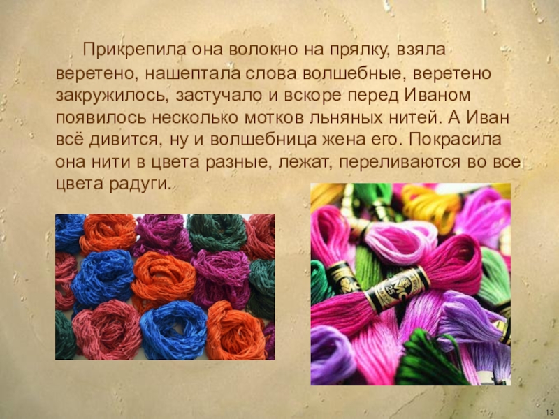 Слайд 13 Прикрепила она волокно на прялку, взяла веретено,