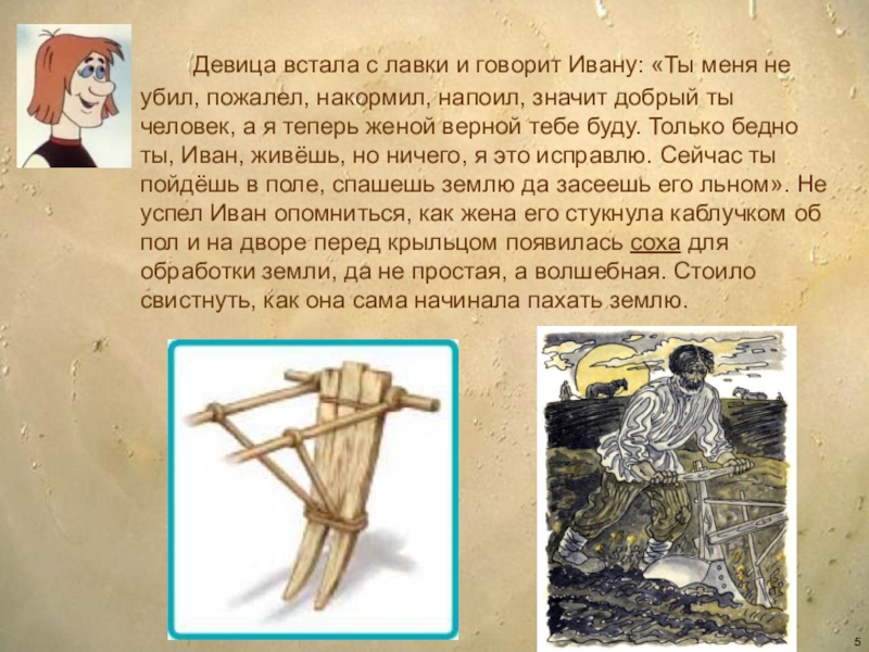 «Ты меня не убил, пожалел, накормил, напоил, значит добрый ты человек, а я теперь женой верной тебе буду. Только бедно ты, Иван, живёшь, но ничего, я это исправлю. Сейчас ты пойдёшь в поле, спашешь землю да засеешь его льном». Не успел Иван опомниться, как жена его стукнула каблучком об пол и на дворе перед крыльцом появилась соха для обработки земли, да не простая, а волшебная. Стоило свистнуть, как она сама начинала пахать землю.