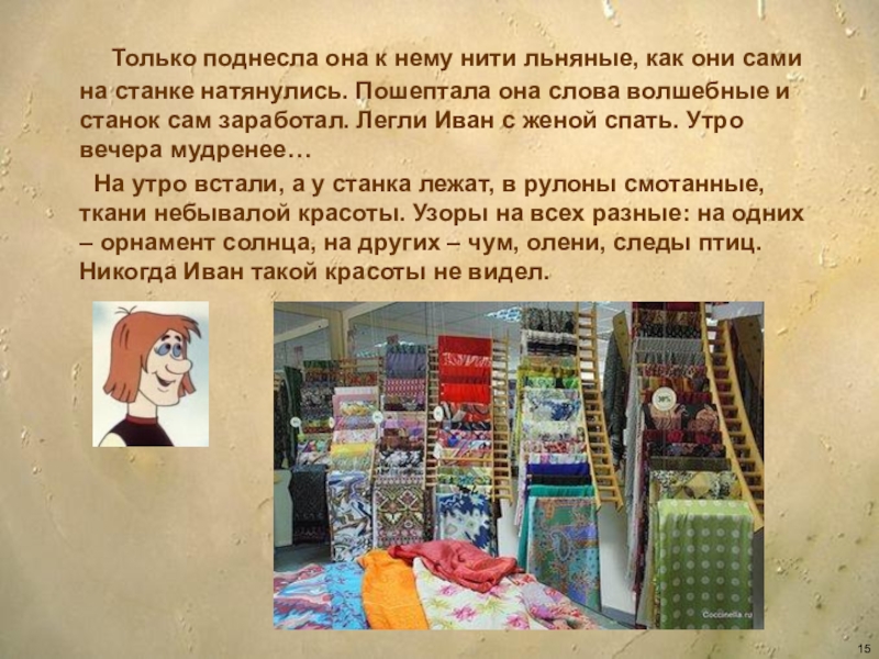 На утро встали, а у станка лежат, в рулоны смотанные, ткани небывалой красоты. Узоры на всех разные: на одних – орнамент солнца, на других – чум, олени, следы птиц. Никогда Иван такой красоты не видел.