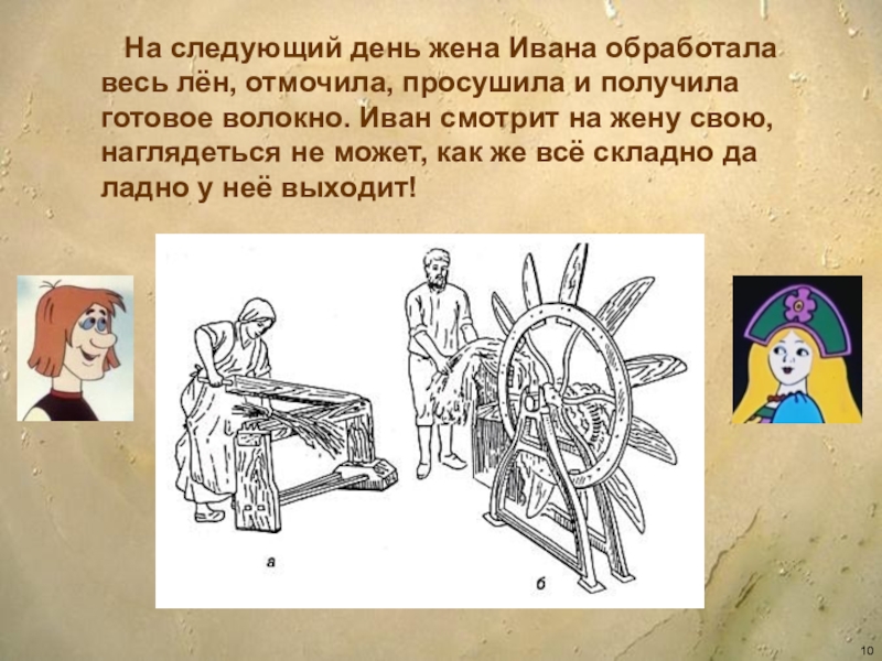 лён, отмочила, просушила и получила готовое волокно. Иван смотрит на жену свою, наглядеться не может, как же всё складно да ладно у неё выходит!