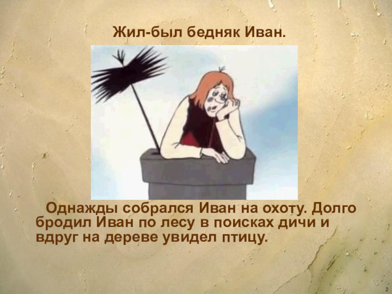 Иван на охоту. Долго бродил Иван по лесу в поисках дичи и вдруг на дереве увидел птицу.