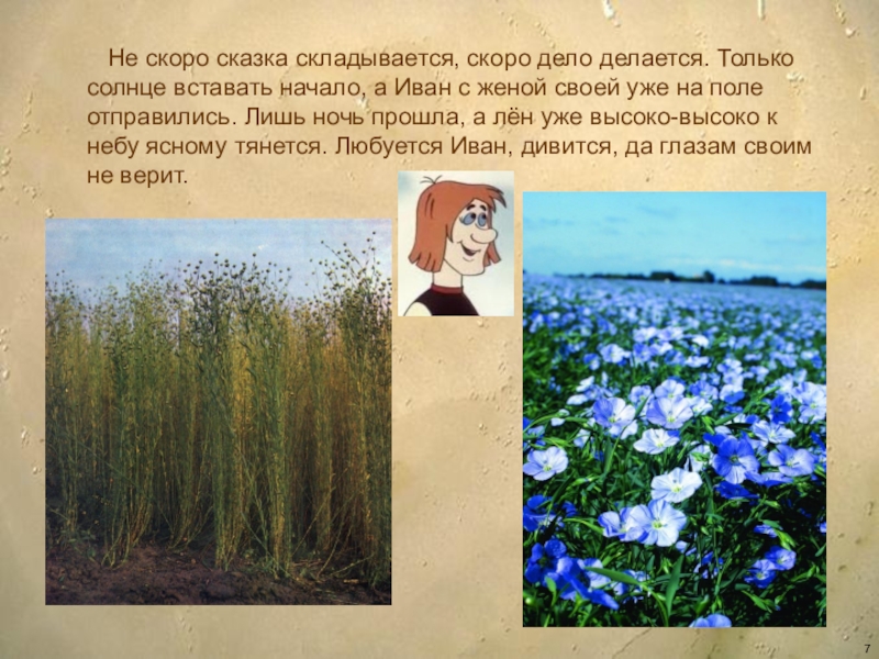 Только солнце вставать начало, а Иван с женой своей уже на поле отправились. Лишь ночь прошла, а лён уже высоко-высоко к небу ясному тянется. Любуется Иван, дивится, да глазам своим не верит.