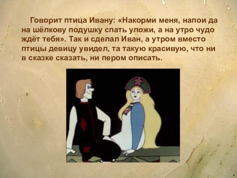 Слайд 4 Говорит птица Ивану: «Накорми меня, напои да