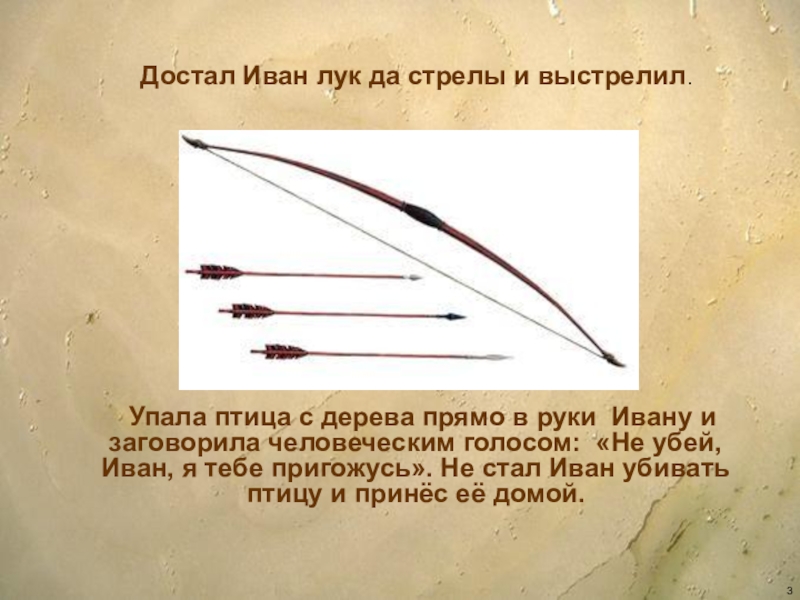 Слайд 3 Достал Иван лук да стрелы и выстрелил.