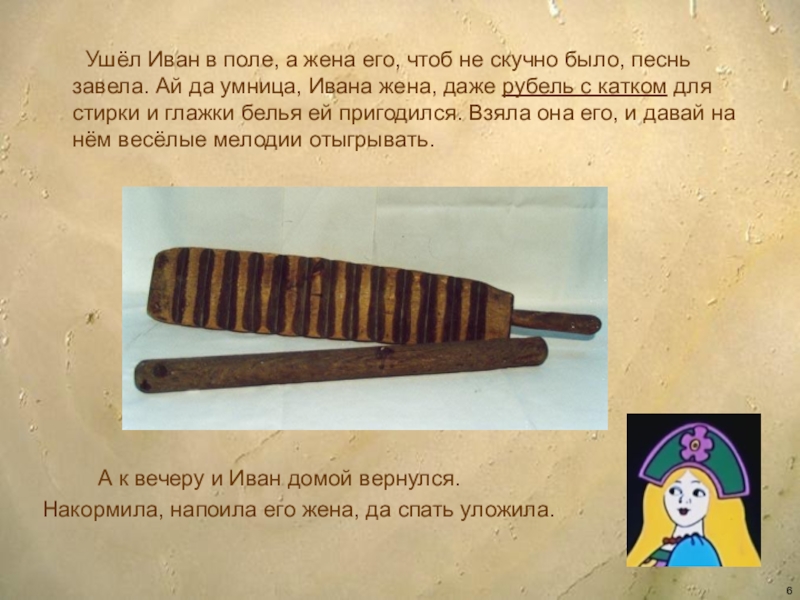 чтоб не скучно было, песнь завела. Ай да умница, Ивана жена, даже рубель с катком для стирки и глажки белья ей пригодился. Взяла она его, и давай на нём весёлые мелодии отыгрывать.