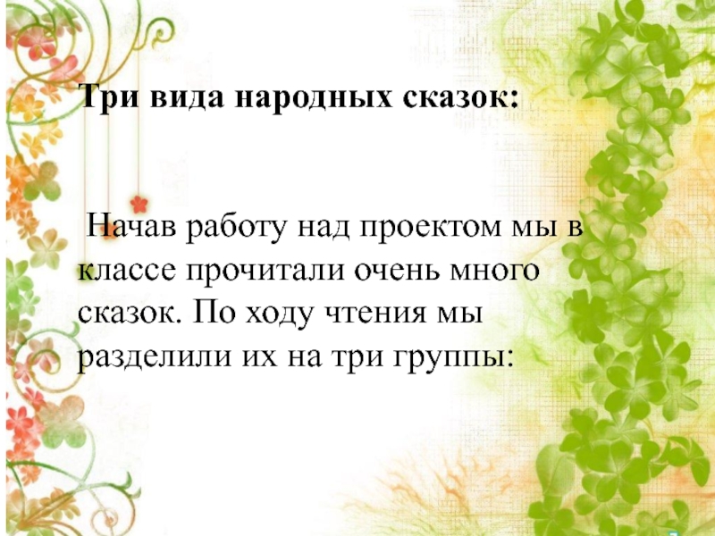 Начав работу над проектом мы в классе прочитали очень много сказок. По ходу чтения мы разделили их на три группы: