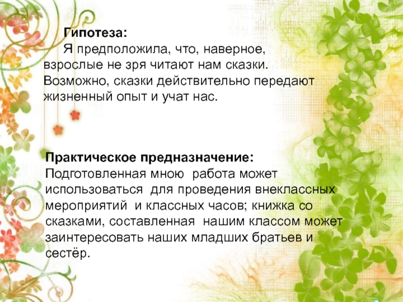 Подготовленная мною работа может использоваться для проведения внеклассных мероприятий и классных часов; книжка со сказками, составленная нашим классом может заинтересовать наших младших братьев и сестёр.