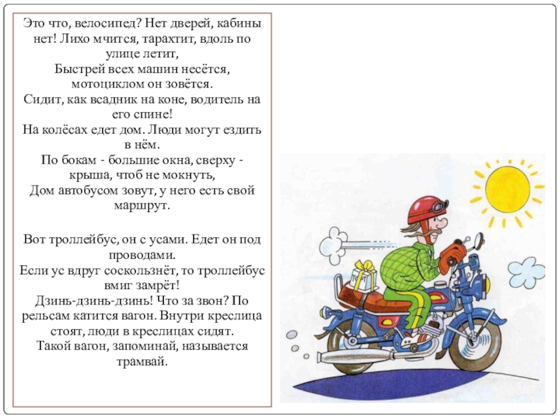 Слайд 5Это что, велосипед? Нет дверей, кабины нет! Лихо мчится, тарахтит, вдоль