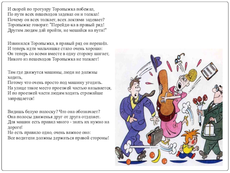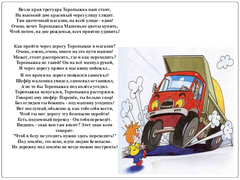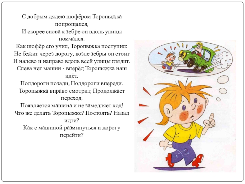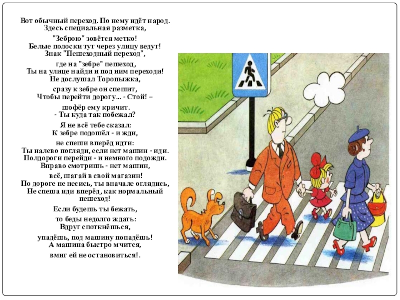 Слева нет машин - вперёд Торопыжка наш идёт.