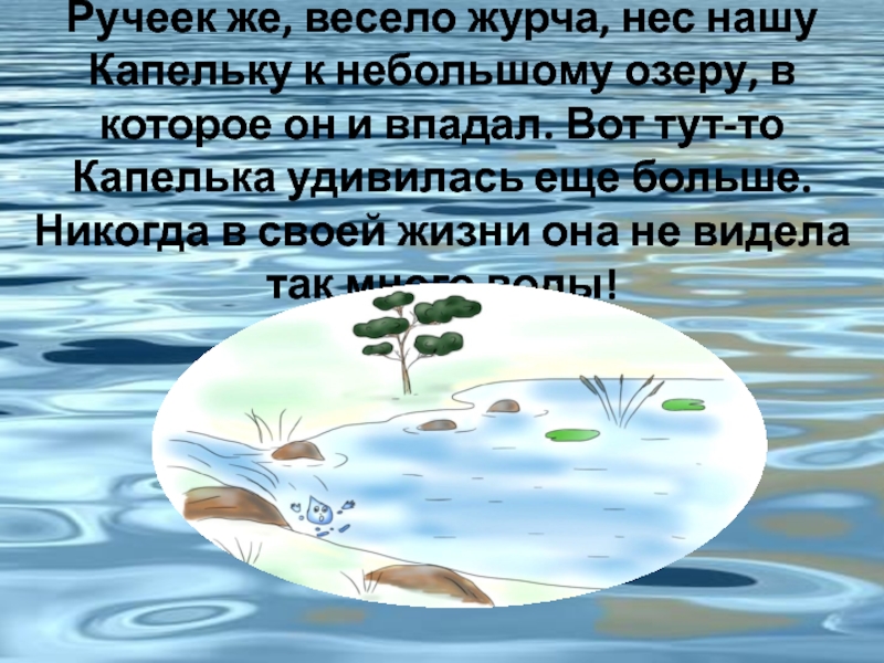 Слайд 6 Ручеек же, весело журча, нес нашу Капельку к небольшому озеру, в