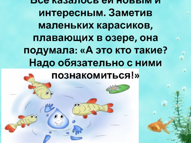 Слайд 7 Все казалось ей новым и интересным. Заметив маленьких карасиков, плавающих в