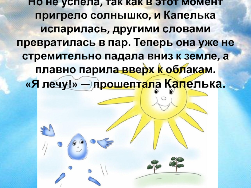Но не успела, так как в этот момент пригрело солнышко, и Капелька испарилась, другими словами превратилась