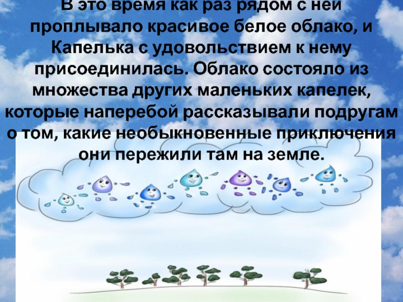 В это время как раз рядом с ней проплывало красивое белое облако, и Капелька с удовольствием