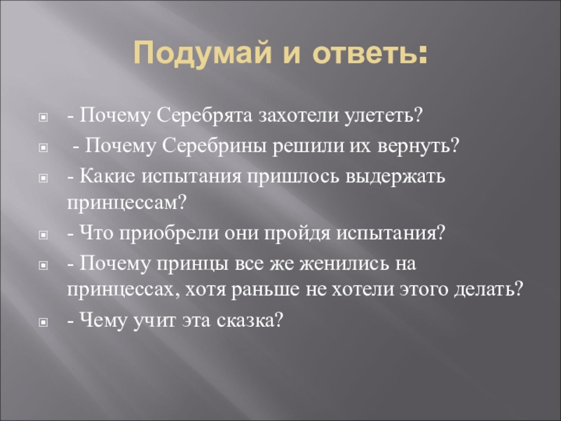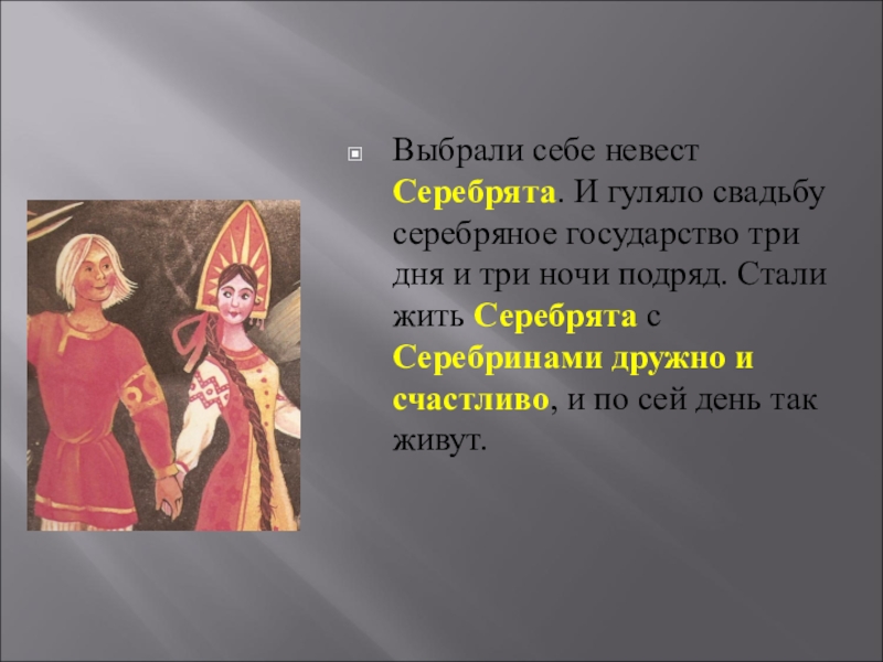 Слайд 12Выбрали себе невест Серебрята. И гуляло свадьбу серебряное государство три дня