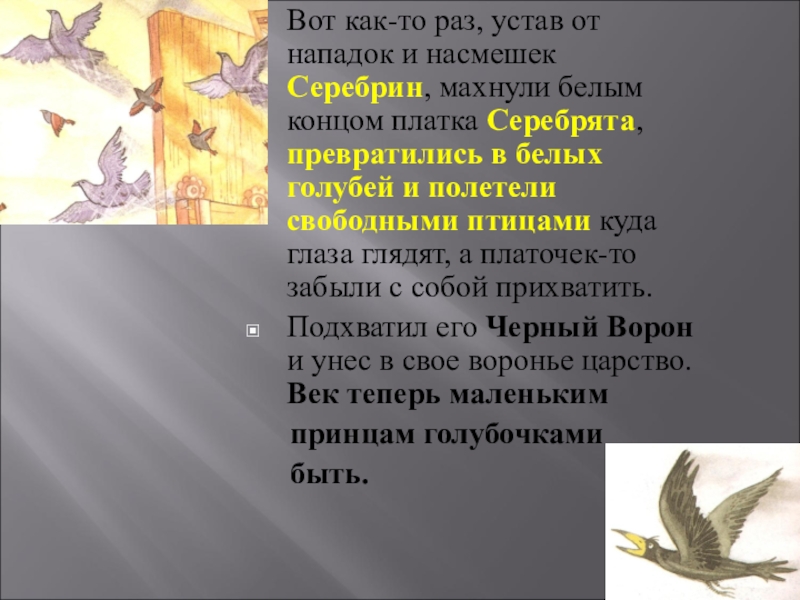 концом платка Серебрята, превратились в белых голубей и полетели свободными птицами куда глаза глядят, а платочек-то забыли с собой прихватить.