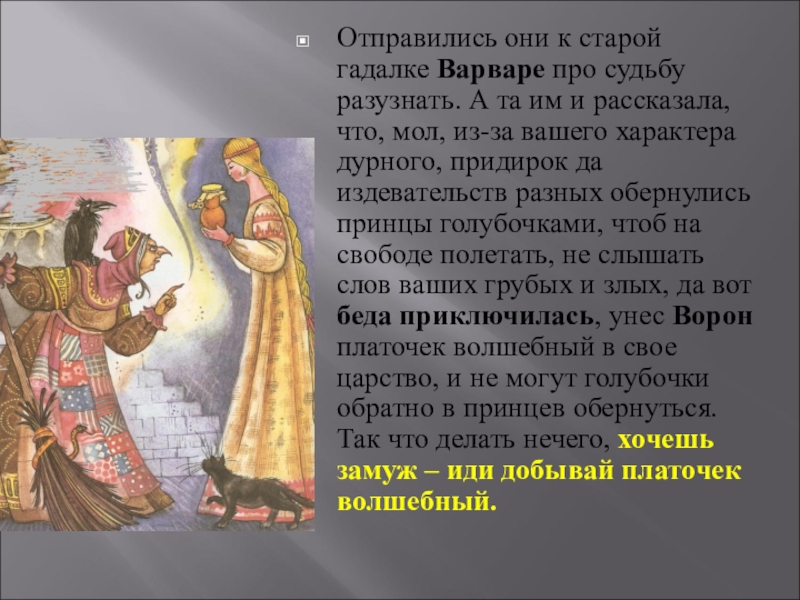 Слайд 9Отправились они к старой гадалке Варваре про судьбу разузнать. А та
