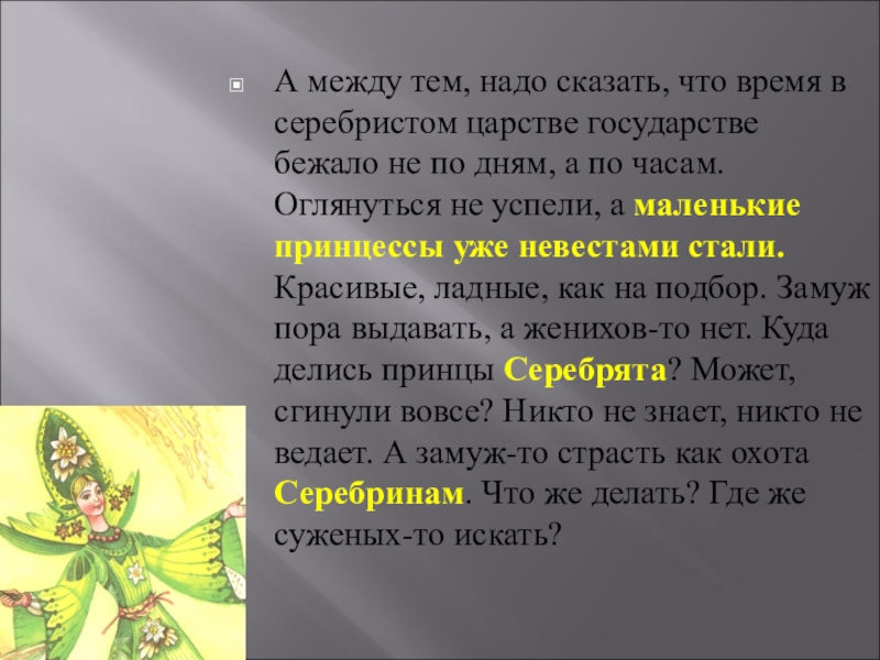 Слайд 8А между тем, надо сказать, что время в серебристом царстве государстве