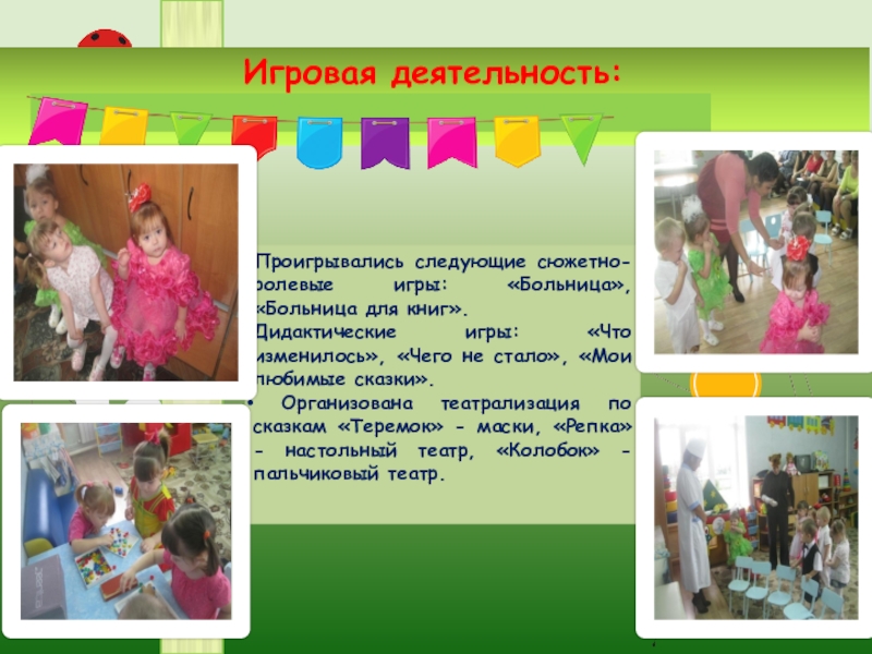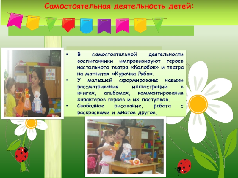 • Демонстрация некоторых элементов театрализации –показы эмоций героев, жестов, проигрывание ролей.