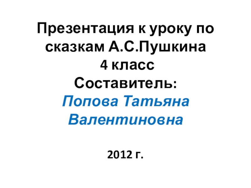 Слайд 1Презентация к уроку по сказкам А.С.Пушкина 4 класс Составитель: Попова Татьяна Валентиновна 2012