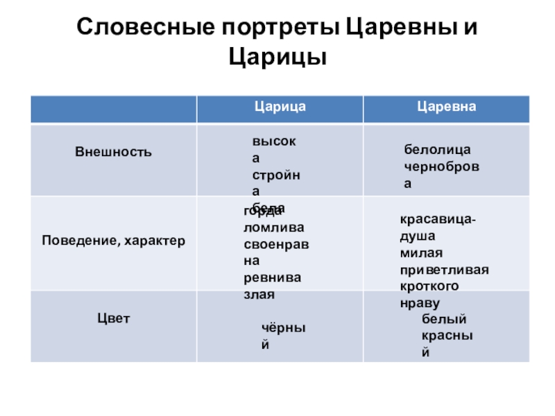 Словесные портреты Царевны и Царицывысокастройнабелабелолицачернобровагордаломливасвоенравнаревнивазлаякрасавица-душамилаяприветливаякроткого нравучёрныйбелыйкрасный