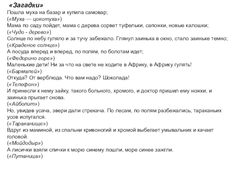 знания детей о прочитанных сказках К. И. Чуковского, представления о жанровых особенностях сказки;