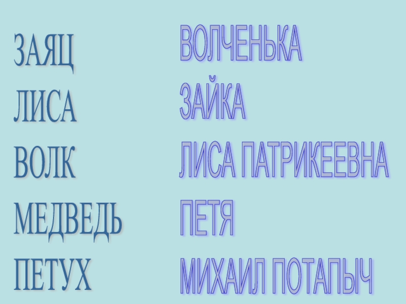 ЗАЯЦ  ЛИСА  ВОЛК  МЕДВЕДЬ  ПЕТУХВОЛЧЕНЬКА  ЗАЙКА  ЛИСА ПАТРИКЕЕВНА  ПЕТЯ