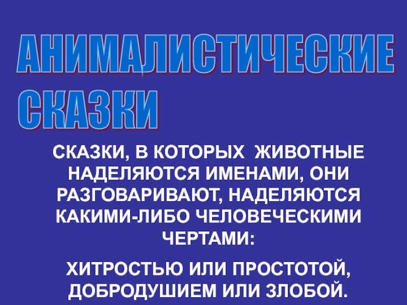 АНИМАЛИСТИЧЕСКИЕ СКАЗКИСКАЗКИ, В КОТОРЫХ ЖИВОТНЫЕ НАДЕЛЯЮТСЯ ИМЕНАМИ, ОНИ РАЗГОВАРИВАЮТ, НАДЕЛЯЮТСЯ КАКИМИ-ЛИБО ЧЕЛОВЕЧЕСКИМИ ЧЕРТАМИ: ХИТРОСТЬЮ ИЛИ ПРОСТОТОЙ, ДОБРОДУШИЕМ ИЛИ ЗЛОБОЙ.