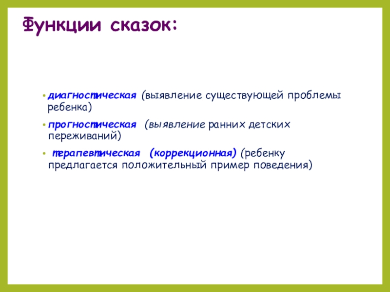 Функции сказок: диагностическая (выявление существующей проблемы ребенка)прогностическая  (выявление ранних детских переживаний)  терапевтическая  (коррекционная) (ребенку предлагается положительный пример поведения)