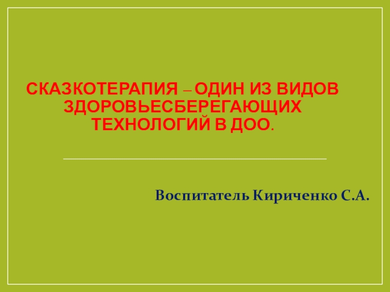 СКАЗКОТЕРАПИЯ – ОДИН ИЗ ВИДОВ ЗДОРОВЬЕСБЕРЕГАЮЩИХ ТЕХНОЛОГИЙ В ДОО. Воспитатель Кириченко С.А.