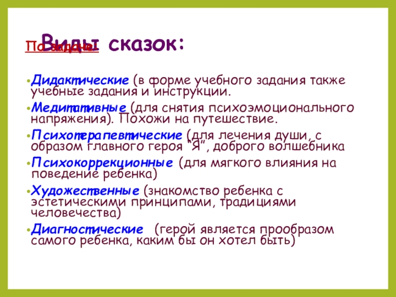 Виды сказок: По задаче:Дидактические (в форме учебного задания также учебные задания и инструкции.Медитативные (для снятия психоэмоционального напряжения).