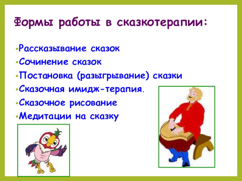 Формы работы в сказкотерапии:   Рассказывание сказокСочинение сказокПостановка (разыгрывание) сказкиСказочная имидж-терапия.Сказочное рисованиеМедитации на сказку