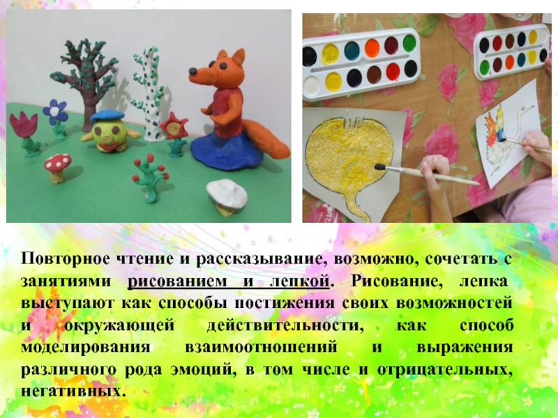 Слайд 13Повторное чтение и рассказывание, возможно, сочетать с занятиями рисованием и лепкой.