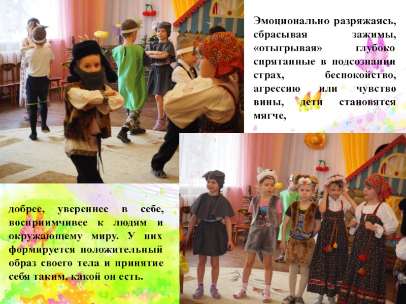 Слайд 25Эмоционально разряжаясь, сбрасывая зажимы, «отыгрывая» глубоко спрятанные в подсознании страх, беспокойство,