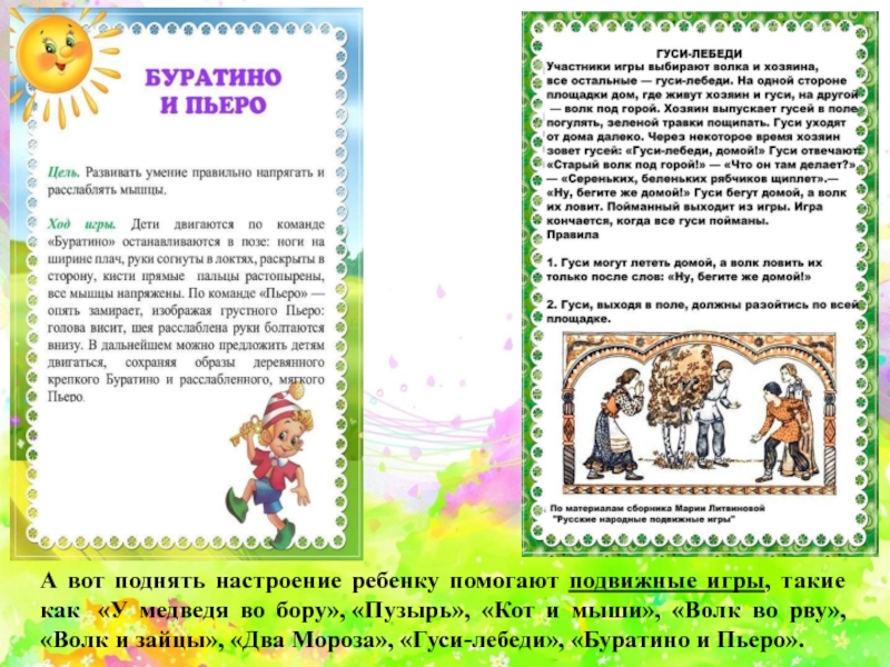 Слайд 12А вот поднять настроение ребенку помогают подвижные игры, такие как «У
