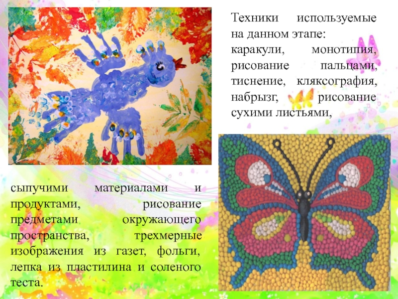 сыпучими материалами и продуктами, рисование предметами окружающего пространства, трехмерные изображения из газет, фольги, лепка из пластилина и соленого теста.