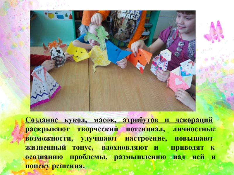 Слайд 16Создание кукол, масок, атрибутов и декораций раскрывают творческий потенциал, личностные возможности,